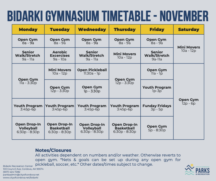 Bidarki Recreation Center is a public facility intended for the use of City of Cordova residents and visitors. The Recreation Center is a welcoming and safe place. Please take the time to read over a few simple rules to help things run smoothly and make sure everyone enjoys all our Center has to offer. Participants of the Bidarki Recreation Center are expected to conduct themselves in a manner that most people would find reasonable and that does not infringe on the enjoyment of others.