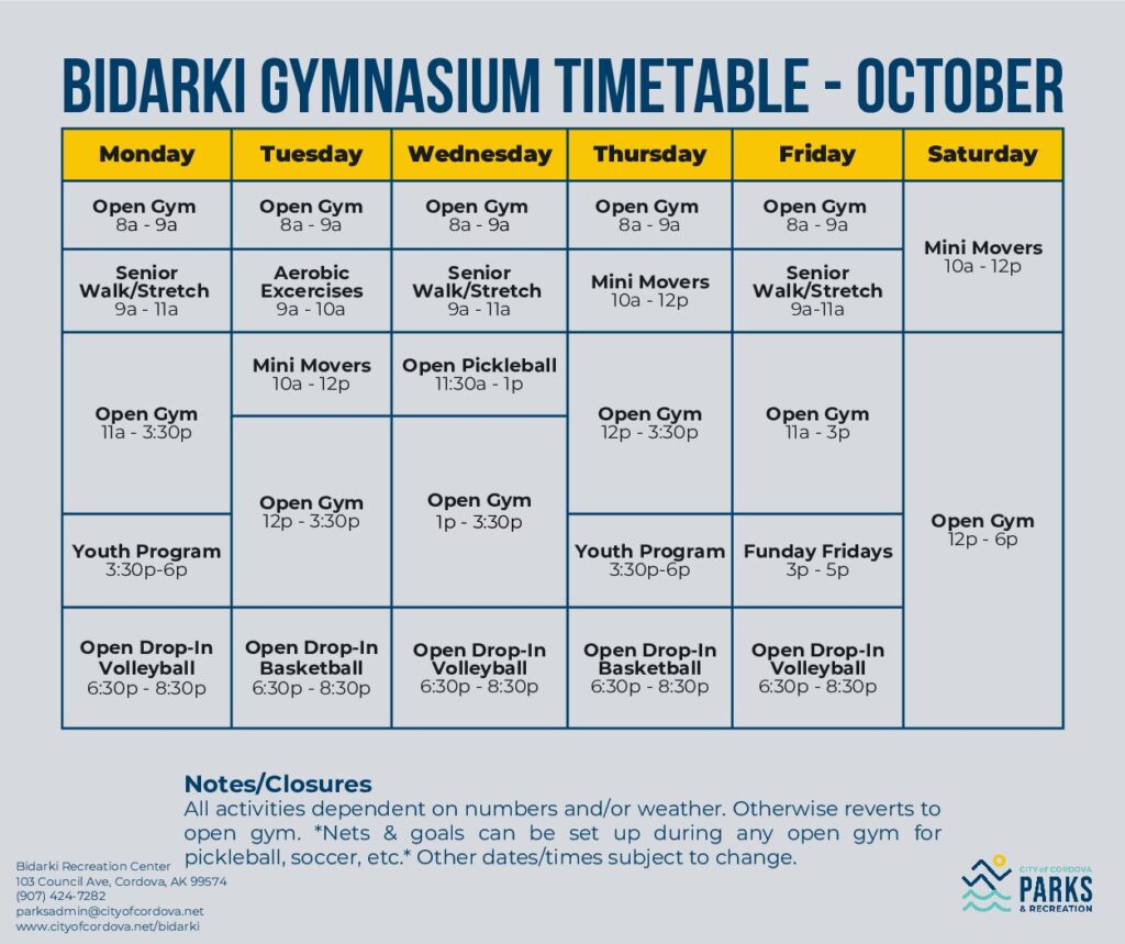 For information please contact us on (907) 424-7282 or email parksadmin@cityofcordova.net